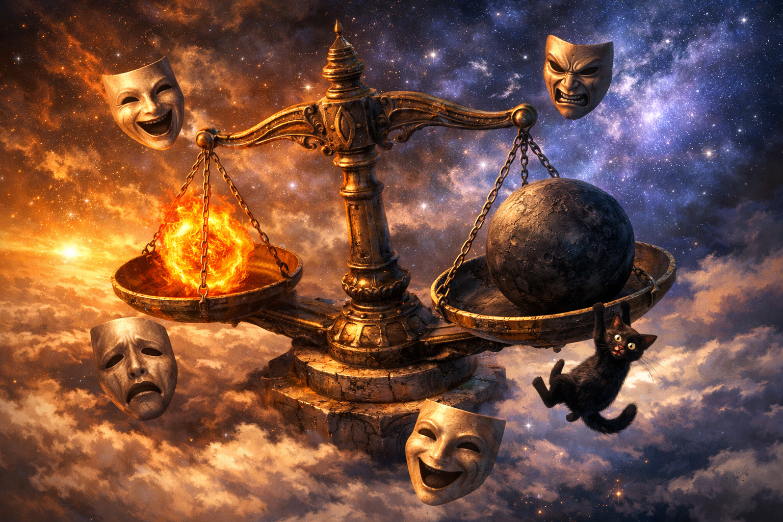 巨大な天秤が浮かぶ幻想空間。片側には燃える小さな太陽、もう片側には重たい黒い惑星が乗っている。背景は宇宙と雲海が混ざる不思議な空間。天秤の周囲を、表情の違う四つの仮面(喜・怒・哀・楽)がゆっくり回転している。構図は斜め俯瞰で、主役は中央ではなく画面左奥の天秤。光は逆光気味の強いオレンジ光と青紫の宇宙光。色調は深い紺、オレンジ、紫、黒。質感は金属と石の重さを感じる表面。状態は静かに均衡しながら少し揺れている。小さな黒猫が天秤の端にぶら下がってバランスを崩しかけているコミカル要素。文字なし。