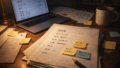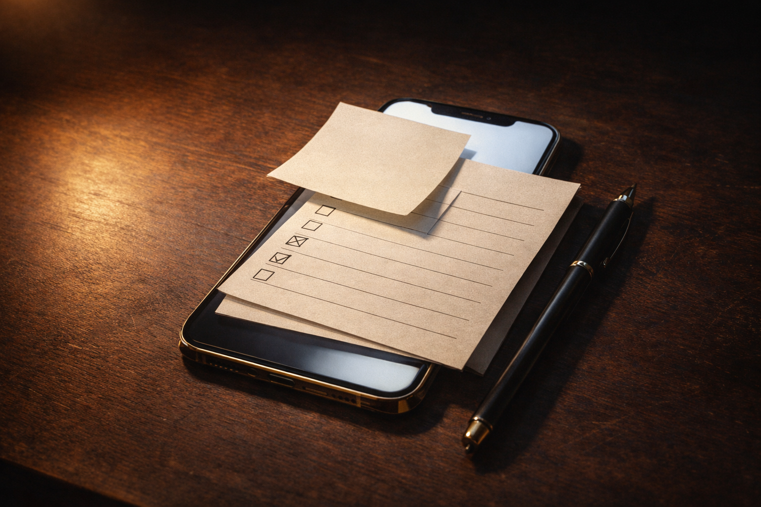 【空間設定】 深夜の作業机、スマホ画面の上にメモ帳とチェックボックス用紙が重なっている 【主役モチーフ】 金色の細いラインが入ったスマホ、白い付箋3枚、黒いペン 【構図】 斜め上からの俯瞰、机の左上に余白を残す 【光】 デスクライトの暖色、画面の白い光が紙に反射 【色調】 黒、白、金、少しだけ深い紺 【質感】 マットな紙、金箔のような細い光沢、ガラスの反射 【状態】 積み上げ途中だが整っている 【動きの有無】 付箋の端が少しだけ浮いている(静かな揺れ)