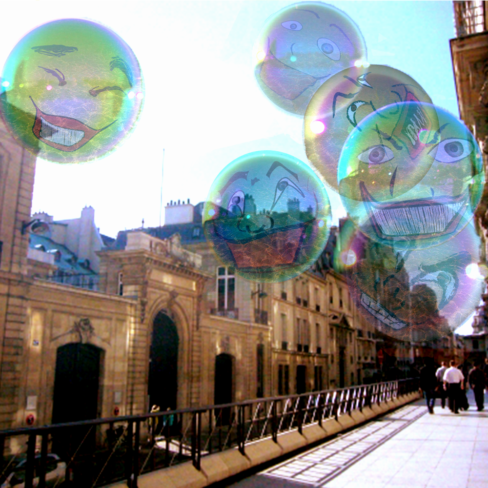 夕方の石畳の通りで、顔つきのシャボン玉を見上げた。