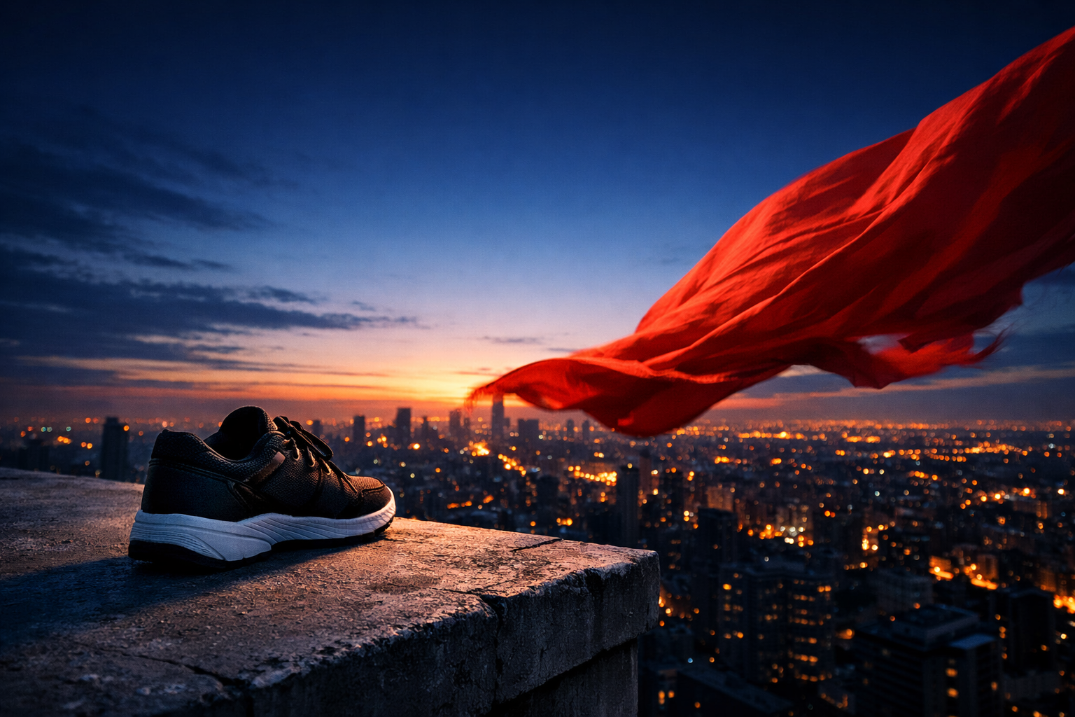 【主役モチーフ】屋上の端に置かれたスニーカー一足、風になびく長い赤い布、遠くに広がる街の光