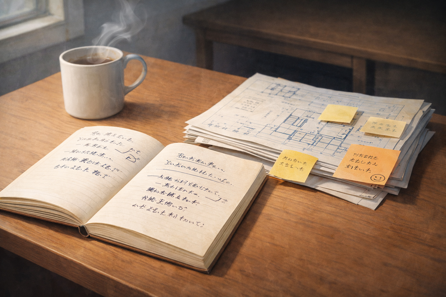 【主役モチーフ】開いたノート1冊、付箋が貼られた設計図の紙束、湯気の立つマグカップ