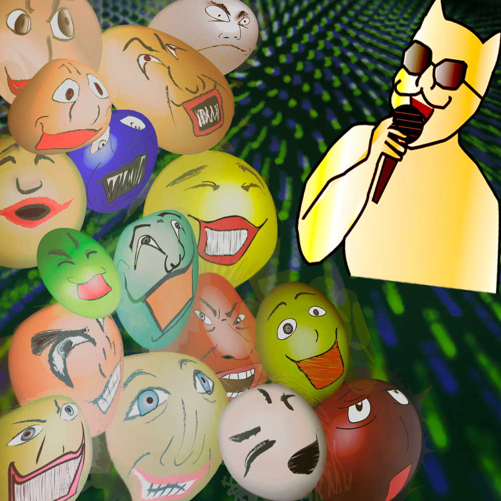 ・マイクを握る猫の横で、感情の顔が膨れ上がる。