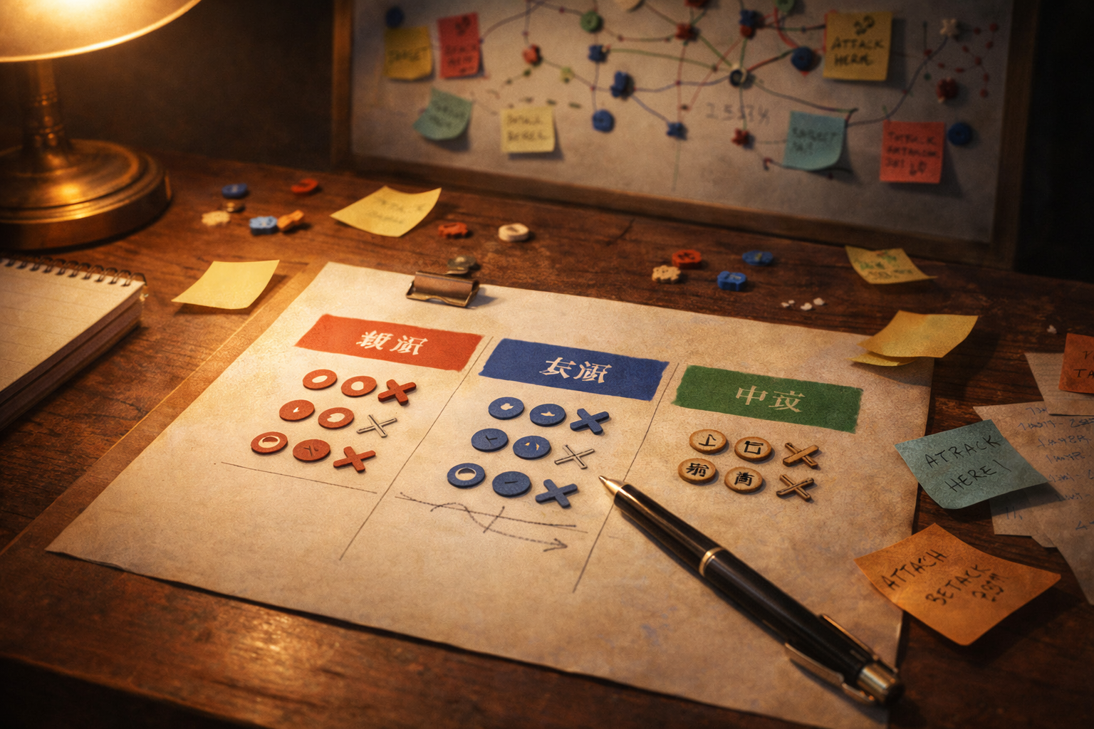 【空間設定】 夜の机、ノートとペン、壁に貼られた作戦ボード、散らばる付箋と小さな駒 【主役モチーフ】 三色に分かれた軍団リストの紙、司令旗、小さな駒(丸/×/理の刻印) 【構図】 斜め上からの俯瞰、机の奥にボード、手前にリスト 【光】 卓上ライトの暖色、周囲は少し暗い 【色調】 赤/青/緑のアクセント+紙の白、木目の茶 【質感】 紙のざらつき、木の机の傷、金属のクリップの冷たさ 【状態】 整え途中、線が引き足されている、付箋が何枚かめくれている 【動きの有無】 付箋が少し浮いている、ペン先にインクの光がにじむ
