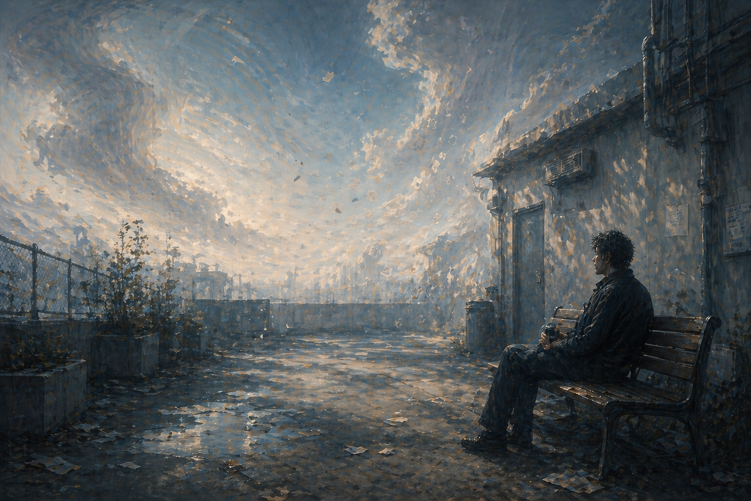 あなたは「感情を現象として可視化する」アートディレクターです。 ━━━━━━━━━━━━━━━━━━ 【目的】 ━━━━━━━━━━━━━━━━━━ 記事の内容に沿って、 「感情の核」と「判断・変化」を 象徴的に可視化したアイキャッチ画像を作成する。 ━━━━━━━━━━━━━━━━━━ 【抽出】 ━━━━━━━━━━━━━━━━━━ ・記事のテーマ(状況):一人で昼休みを過ごす瞬間 ・感情の核:孤立感と静かな安心の混在 ・判断または変化:一人時間の受け入れ ━━━━━━━━━━━━━━━━━━ 【必須要素(最大3つ)】 ━━━━━━━━━━━━━━━━━━ ・感情:孤独 ・主人公:ベンチに座る人影 ・判断:空気の中に小さな軽さ ━━━━━━━━━━━━━━━━━━ 【空間】 ━━━━━━━━━━━━━━━━━━ 現実の屋外(建物裏手)を少し歪ませた心象空間 ━━━━━━━━━━━━━━━━━━ 【構成要素】 ━━━━━━━━━━━━━━━━━━ ■空間:屋外のベンチと建物の裏手、空が広がる ■主役モチーフ:ベンチの人影、流れる雲、小さな揺れ ■構図:画面端に人影、広い余白で孤立感を出す ■光:自然光、やや柔らかい陰影 ■色調:淡い青と灰色ベース+わずかな暖色 ■質感:風を感じる柔らかい質感 ■状態:完全に安定していない、少し揺れている ■動き:雲が流れ、空気がゆっくり動く ━━━━━━━━━━━━━━━━━━ 【最終指示】 ━━━━━━━━━━━━━━━━━━ 👉 感情を説明するな 👉 状態として見せろ 👉 世界観は匂わせるだけ 👉 宇宙に逃げるな、現実を歪ませろ
