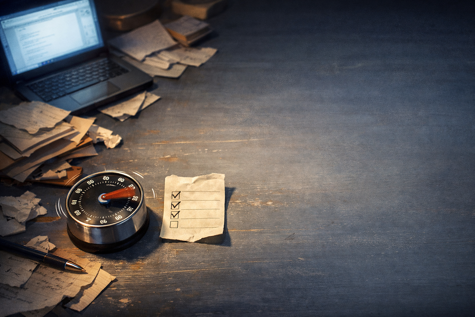 【空間設定】深夜の小さな作業机、散らかったメモとタイマーが置かれた部屋