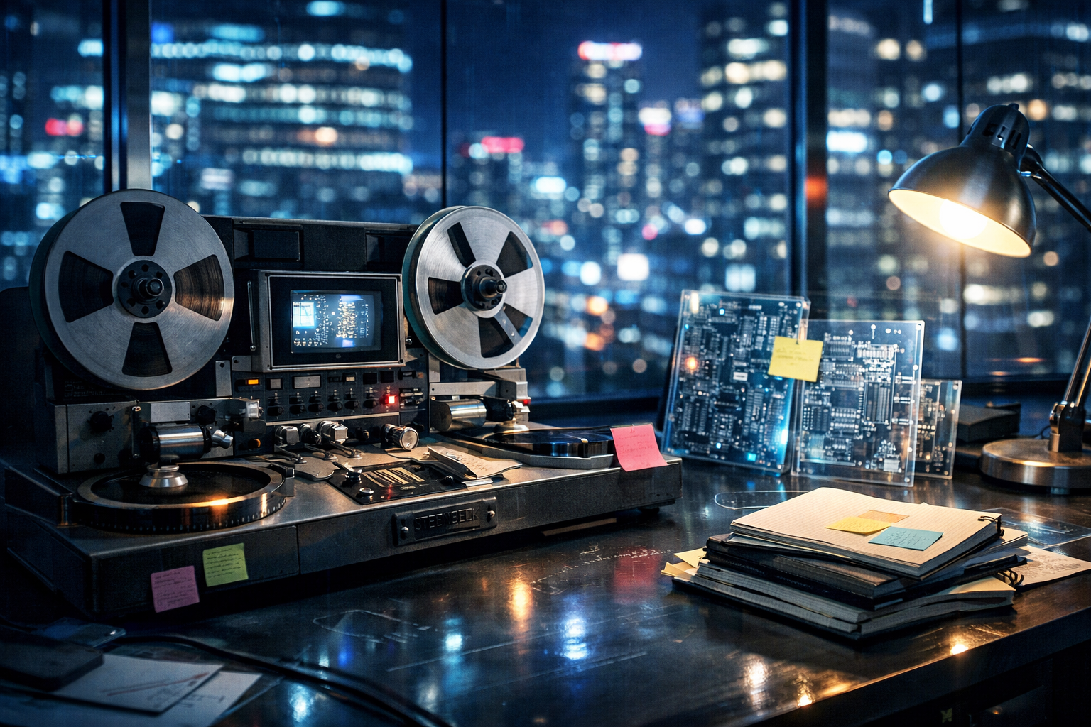 【主役モチーフ】古いフィルム編集機,透明な回路基板,積み上げ途中のノート3冊
