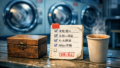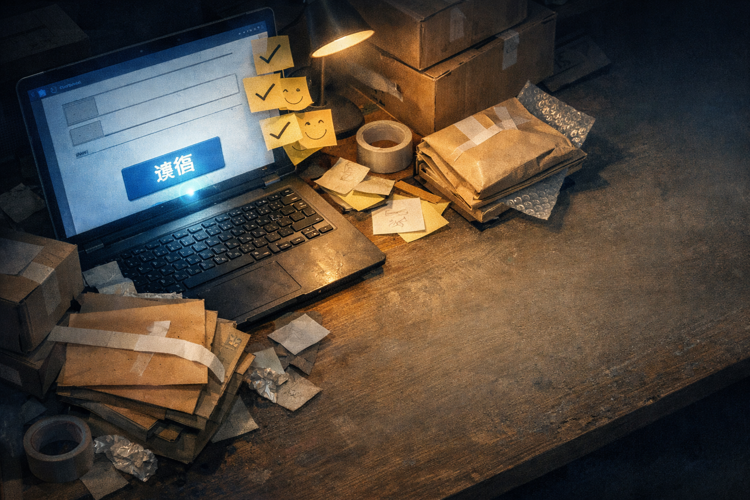 【空間設定】 深夜の小さな作業机、段ボールとメモ用紙が散らばる部屋の片隅