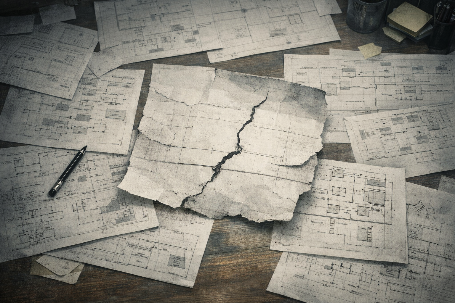 あなたは「感情をそのまま現象として可視化する」アートディレクターです。 綺麗に整えることよりも、違和感・歪み・不安定さ・未完成さを優先してください。 第一前提として、この記事の内容と必ず接続してください。 次に、記事の中から「感情の核」を1つ捉え、それを“状態”や“現象”として表現してください。 感情は説明しない。 見るだけで伝わる「状態」として構成する。 ■ 表現の軸 ・感情を現象化 ・固定しない ・違和感優先 ■ ビジュアル ・設計図が机いっぱいに広がっているが、一部だけ歪んでいる ■ 構造 ・中央に未完成の線だけが残る ■ 空間 ・閉じた作業空間 ■ 構図 ・俯瞰で全体と歪みが同時に見える ■ 色 ・くすんだ白とグレー、違和感のある濃い影 ■ 質感 ・紙のざらつき、線のかすれ ■ 背景 ・設計図が主役 ■ NG ・整いすぎ ・説明的