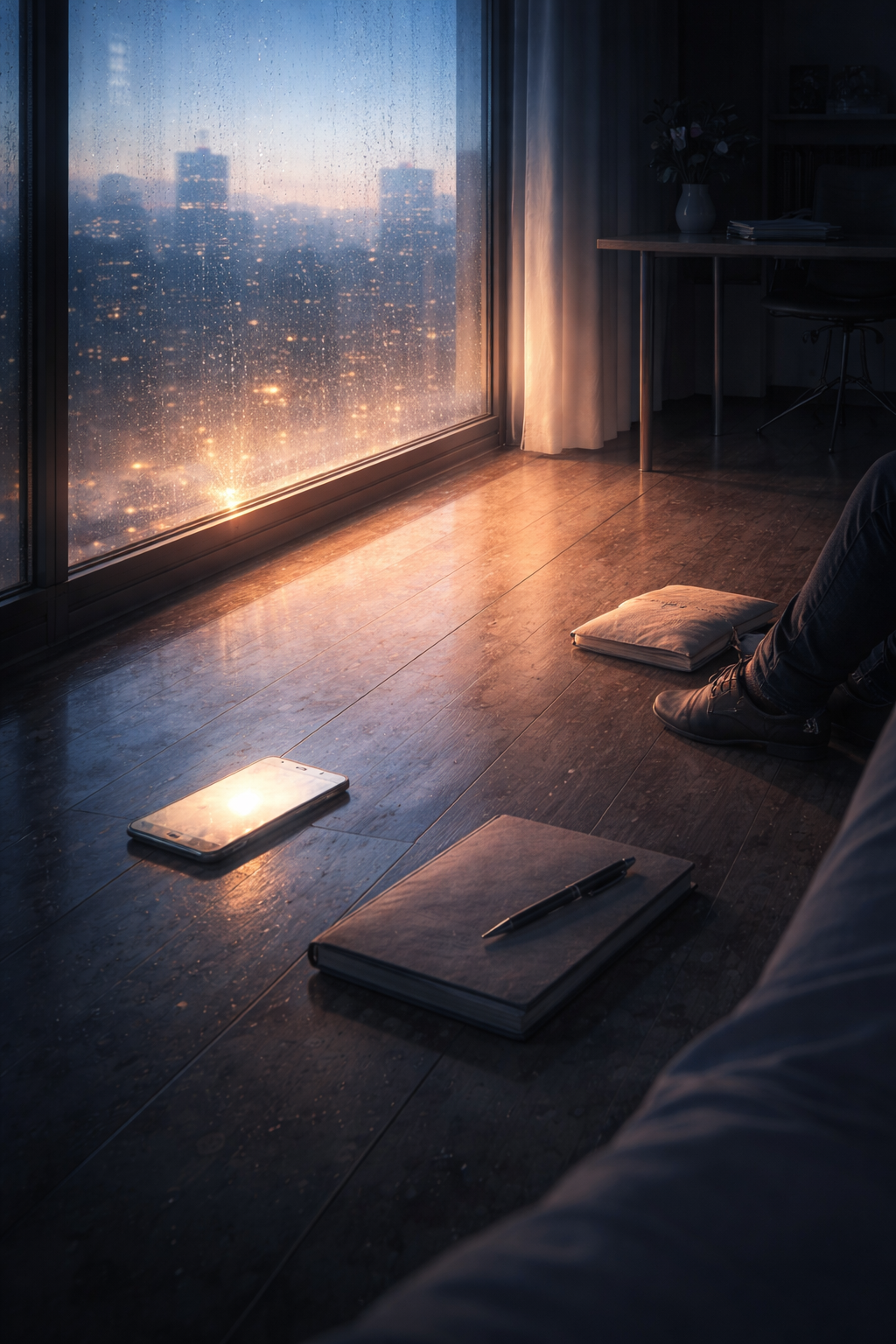 【空間設定】 夜明け前の高層ビルの休憩室、窓際の床 【主役モチーフ】 スマホの発光、閉じたノート、窓ガラスの薄い結露 【構図】 斜め後方の俯瞰、人物は画面の端に寄せて中央を空ける 【光】 スマホの反射光+窓の外から差し始める弱い自然光 【色調】 群青、薄い金、にじむ橙 【質感】 冷たい床の硬さ、ガラスの湿り、光のにじみ 【状態】 静まり返った室内、片付けきれていない机が奥にある 【動きの有無】 静止、光だけが揺れる