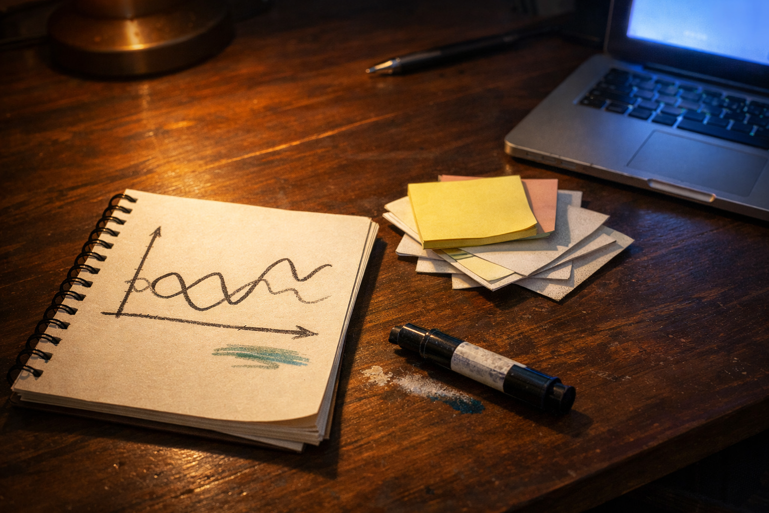 【空間設定】 夜のワークデスク、木目の机、ノートと付箋とペンが散らばり、PCの画面が少しだけ光っている部屋 【主役モチーフ】 波線グラフが描かれたノート1冊、重ねられたメモカード数枚、消しかけのマーカー跡 【構図】 斜め俯瞰、机の左上から右下へ奥行き、主役は左寄せで余白多め 【光】 デスクライトの暖色+PC画面の寒色が混ざる二重光、影は長め 【色調】 焦げ茶の机、生成りの紙、墨黒、薄い青白い光、くすんだオレンジ 【質感】 紙のざらつき、インクのにじみ、付箋の粘着の跡、机の小傷 【状態】 積み上げ途中、整いきっていないが作業の痕跡が残っている 【動きの有無】 静止、ただし紙の端が少し反っている ※感情は書かない ※象徴で表現する ※記事ごとに必ず異なる情景