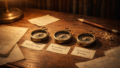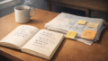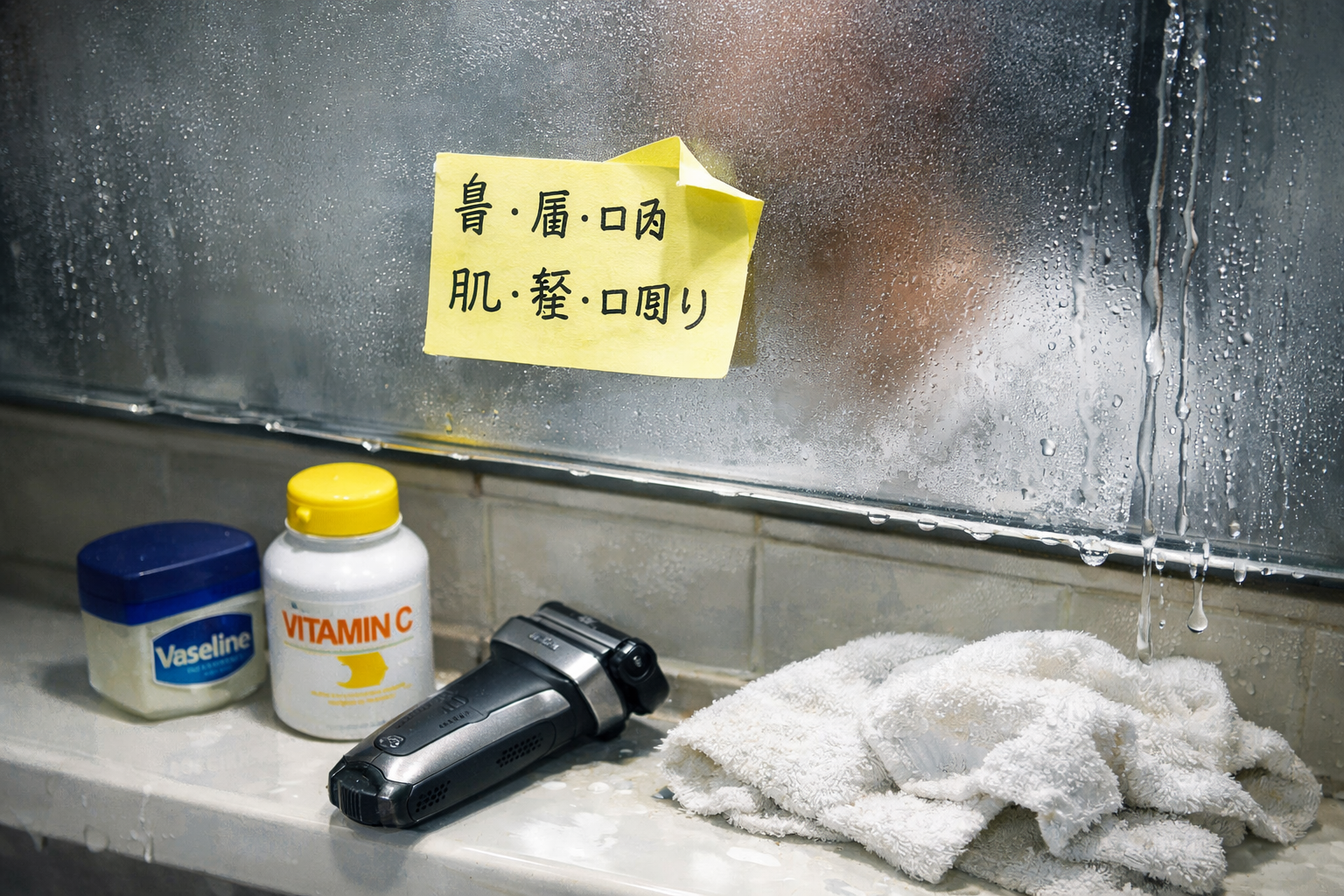薄暗い洗面所の鏡前。曇った鏡に小さな手書きメモが貼られ、「鼻・眉・口角・肌・髪・口周り」とだけ読める。洗面台にはワセリンの小瓶、ビタミンCのボトル、シェーバー、濡れたタオル。蛍光灯の白い光が頬と口元にできる影を強調し、鏡の端には水滴が流れている。整然としきれない生活感の中で、少しだけ“整え直している途中”の温度。俯瞰気味の横構図で、コミカルに小さな付箋が風でめくれている。