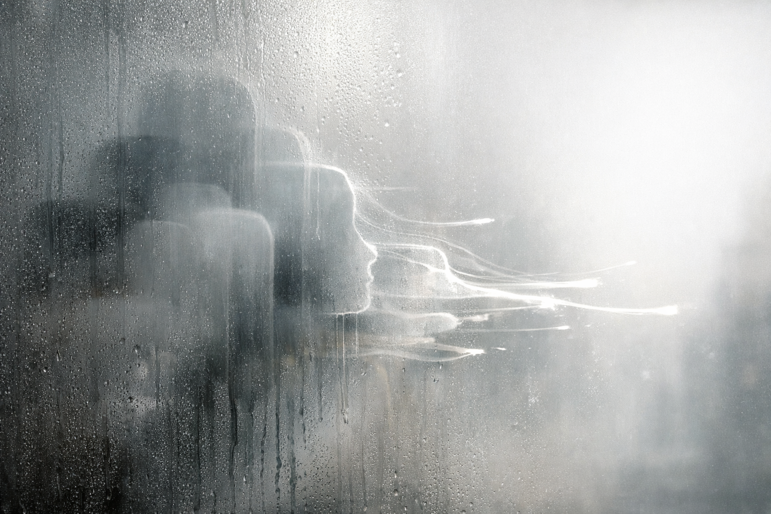 曇ったガラスの向こう側に、重なり合っていた形が少しずつ削られ、軽くなった輪郭だけがにじみ出て外に流れ始めている状態