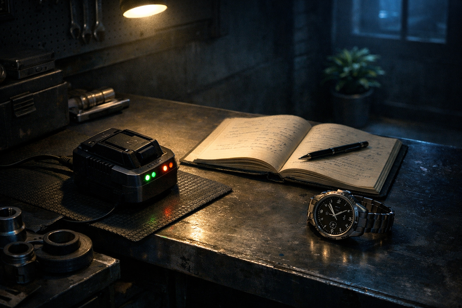 【主役モチーフ】充電中のバッテリーパック、開いたノート、止まった腕時計