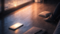 【空間設定】 夜明け前の高層ビル群の屋上 【主役モチーフ】 青年の後ろ姿、遠い地平線の光、揺れるネオン 【構図】 斜め上からの俯瞰、主役は画面右下で中央を外す、広い余白 【光】 地平線から差す橙の逆光+都市の残光 【色調】 群青、深い赤、橙 【質感】 冷たい空気、風に煽られる布、硬いコンクリート 【状態】 夜と朝の境目、消えきらない光が残る 【動きの有無】 強風でコートがなびく、ネオンが微かに揺れる