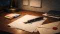 【空間設定】夜の作業部屋のデスク上(紙のノートとノートPC、散らかった付箋がある)