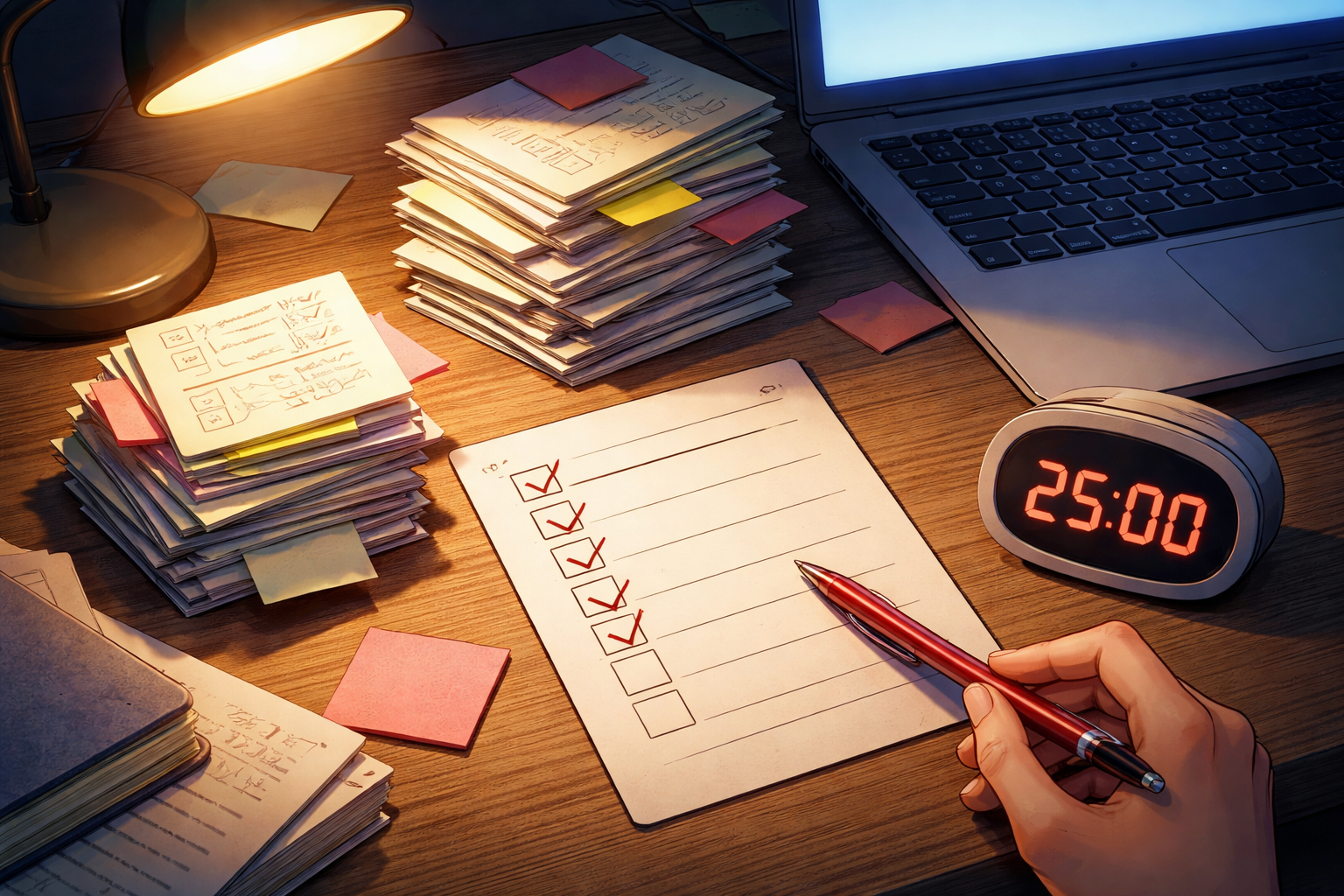 【主役モチーフ】チェックリスト用紙1枚、積み上がったメモの束、タイマー
